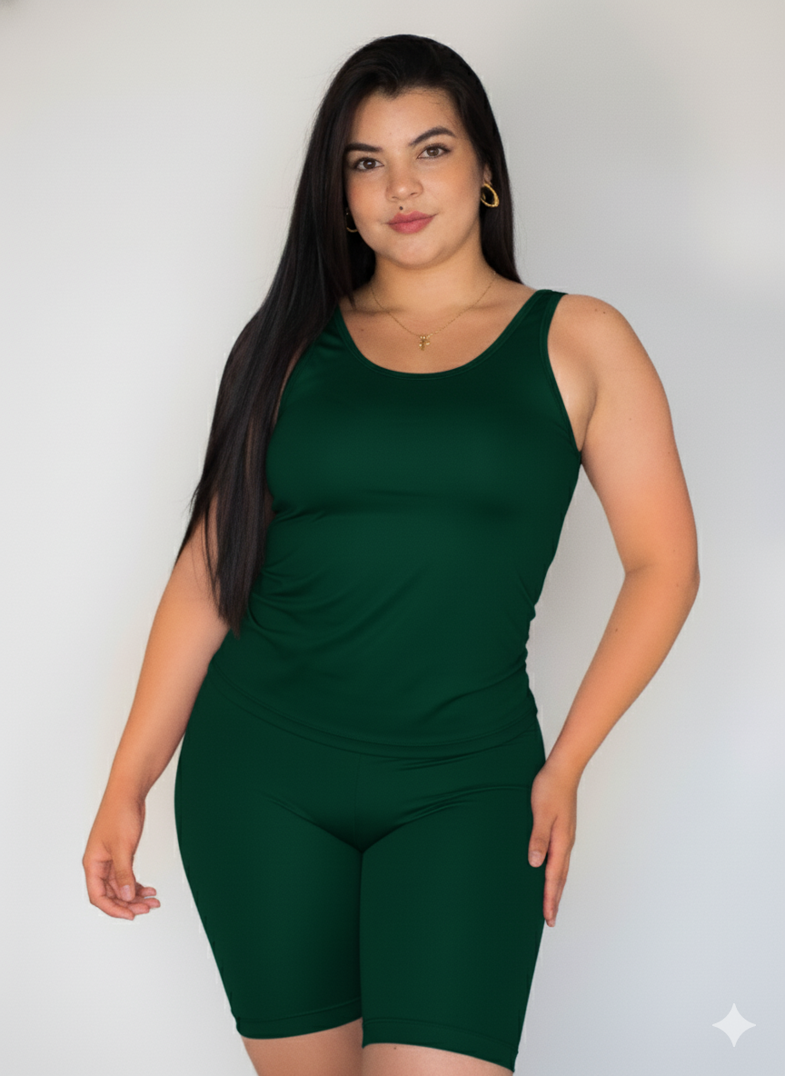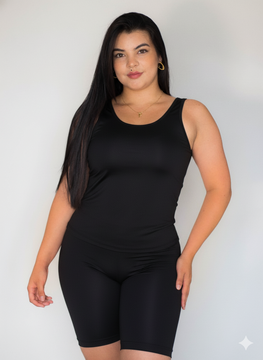 Vestido de Baño Dos Piezas versátil que ofrece máxima cobertura y comodidad. La parte superior es tipo blusa, presenta un cuello redondo clásico y tirantes anchos que brindan un soporte seguro y confortable. La parte inferior es un short de largo medio, estilo ciclista que ofrece cobertura total a la pierna y resulta muy cómodo para moverse, nadar o participar en deportes de playa.