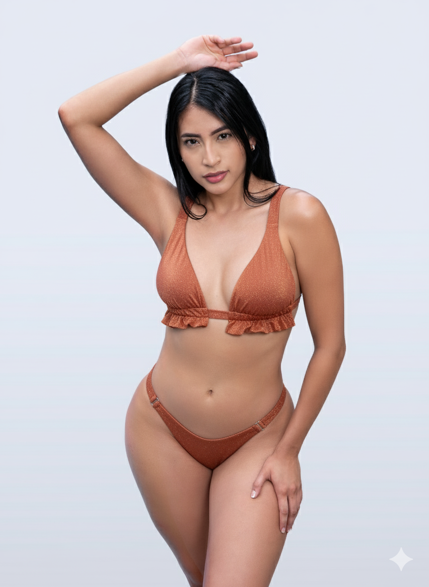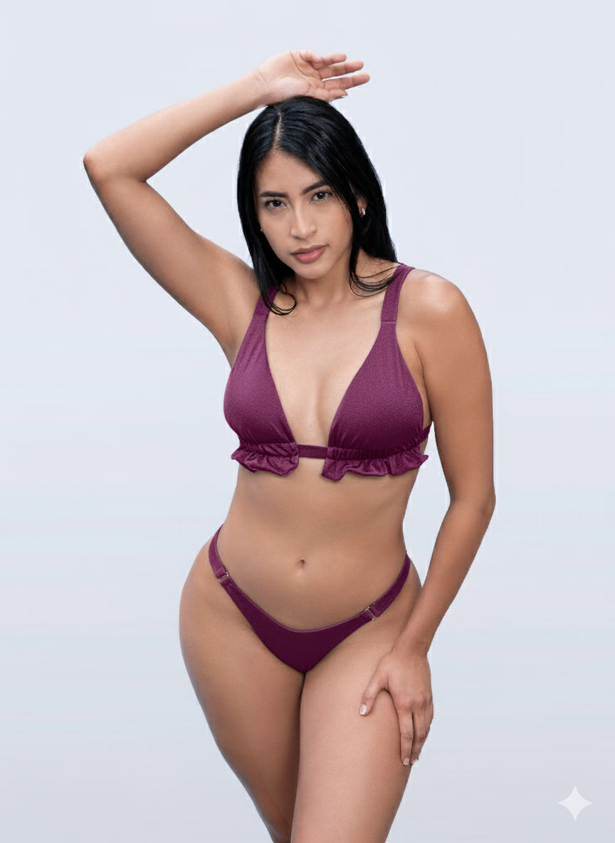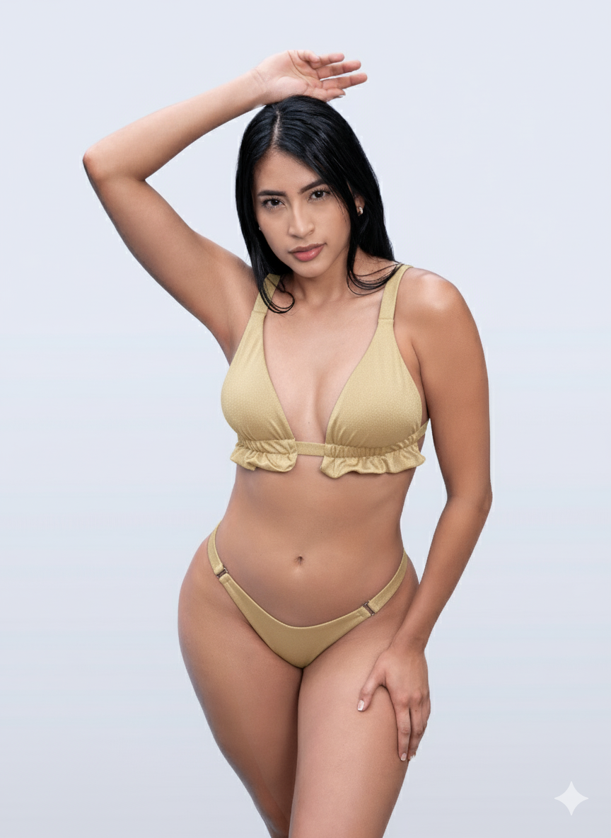 Vestido de Baño Dos Piezas que combina un diseño moderno y coqueto con detalles que realzan la silueta. El top es de corte triangular con tirantes gruesos para mayor soporte, y cuenta con un delicado volante en la parte inferior del top que añade un toque femenino y sofisticado. La tanga cuenta con herrajes metálicos para darle un toque sofisticado y con un fruncido en la parte trasera, ideal para resaltar la figura. Es un vestido perfecto para quiénes buscan un equilibrio entre elegancia y sensualidad.