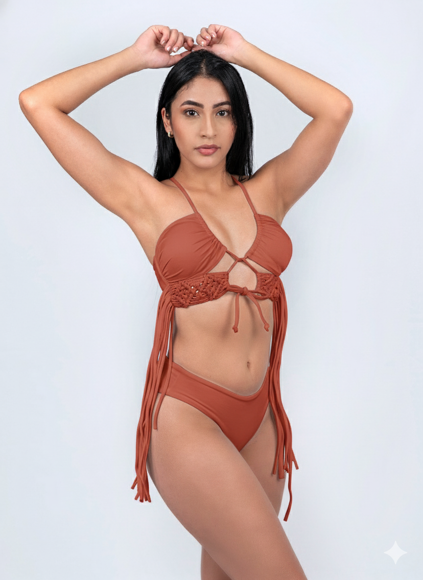 Vestido de Baño Dos Piezas diseñado para realzar la belleza femenina. El top strapless, con tirantes ajustables al cuello proporciona un ajuste seguro y personalizado. El tejido en la base del top, elaborado en macramé, realza de manera elegante y aporta un toque sofisticado. Las tiras cuidadosamente colocadas crean una silueta halagadora y elegante. El panty sencillo, con un delicado recogido en la parte posterior, resalta la figura.