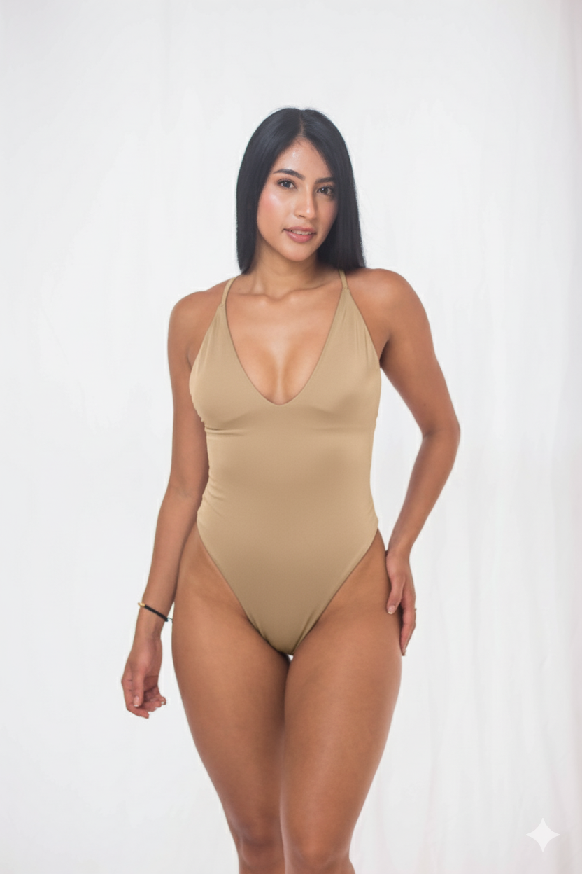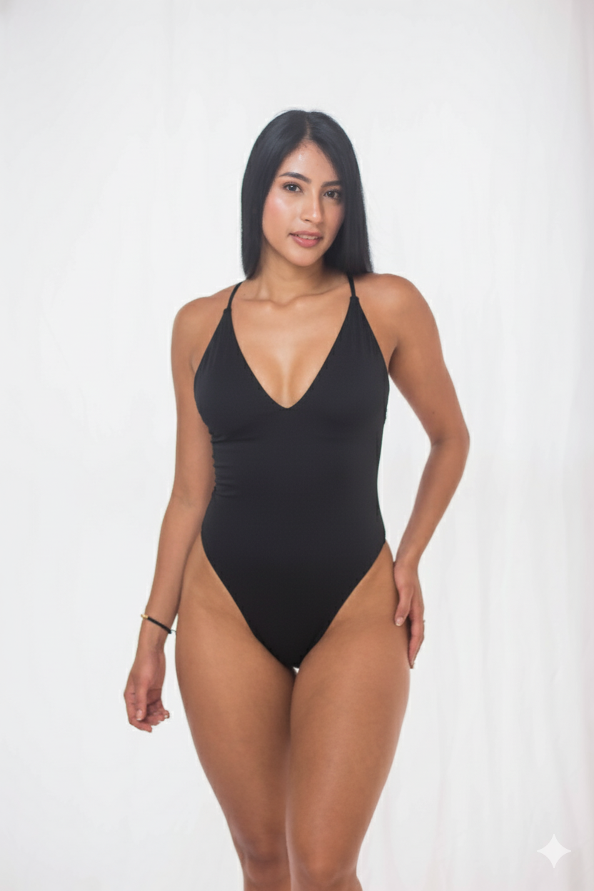 Vestido de Baño Entero de corte alto en la cadera con diseño atrevido y sofisticado. Presenta un escote en V profundo en la parte delantera. La espalda es abierta y las cargaderas se cruzan formando una x, esto permite personalizar la tensión y el soporte. Su corte en la parte inferior es tipo brasilero que resalta la figura, además cuenta con un recogido en la parte trasera de la tanga que realza la figura y aporta un moldeado natural.