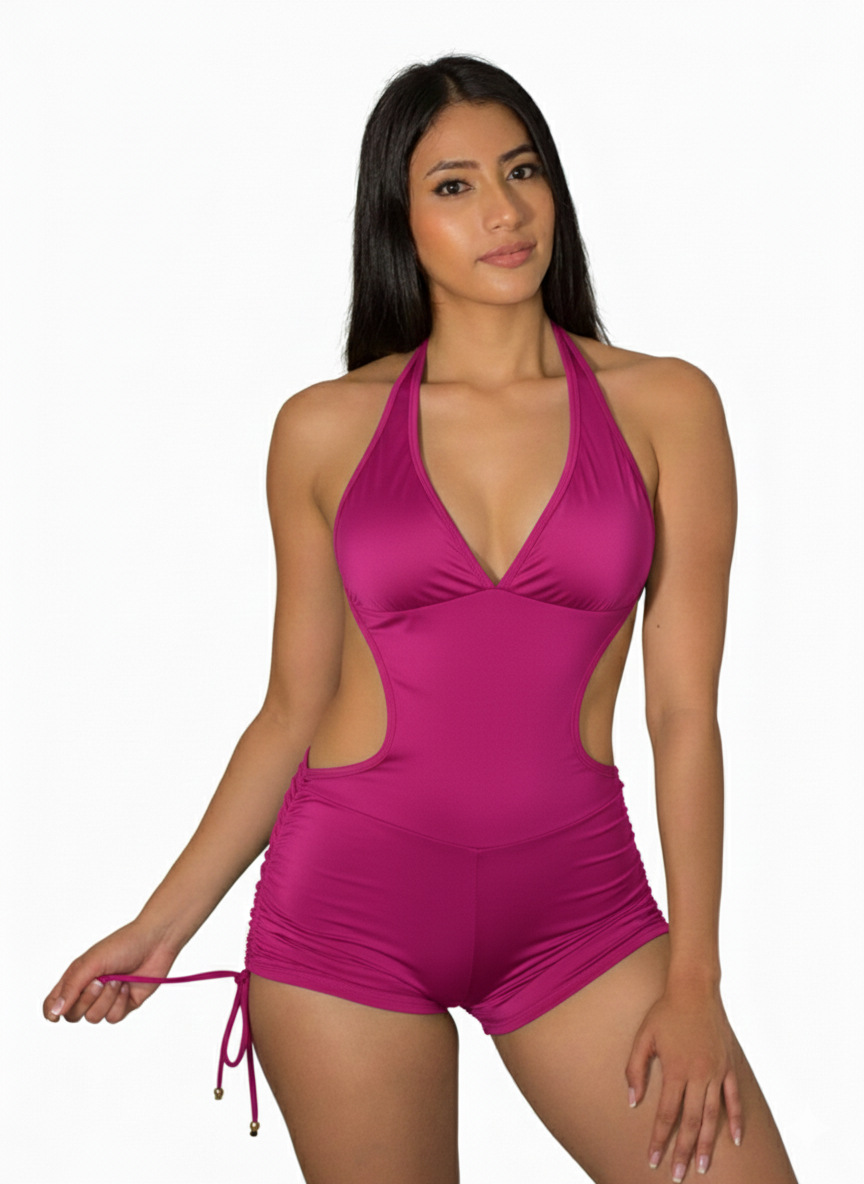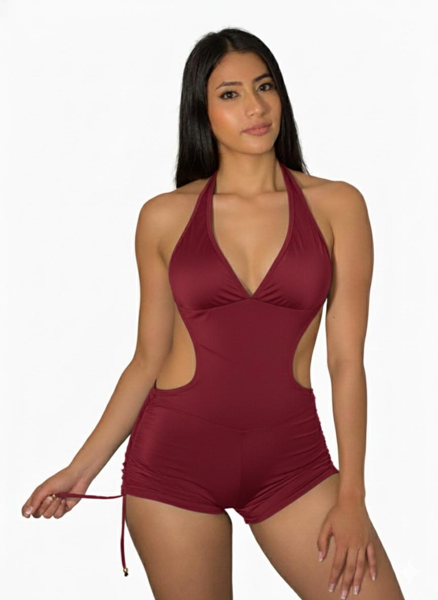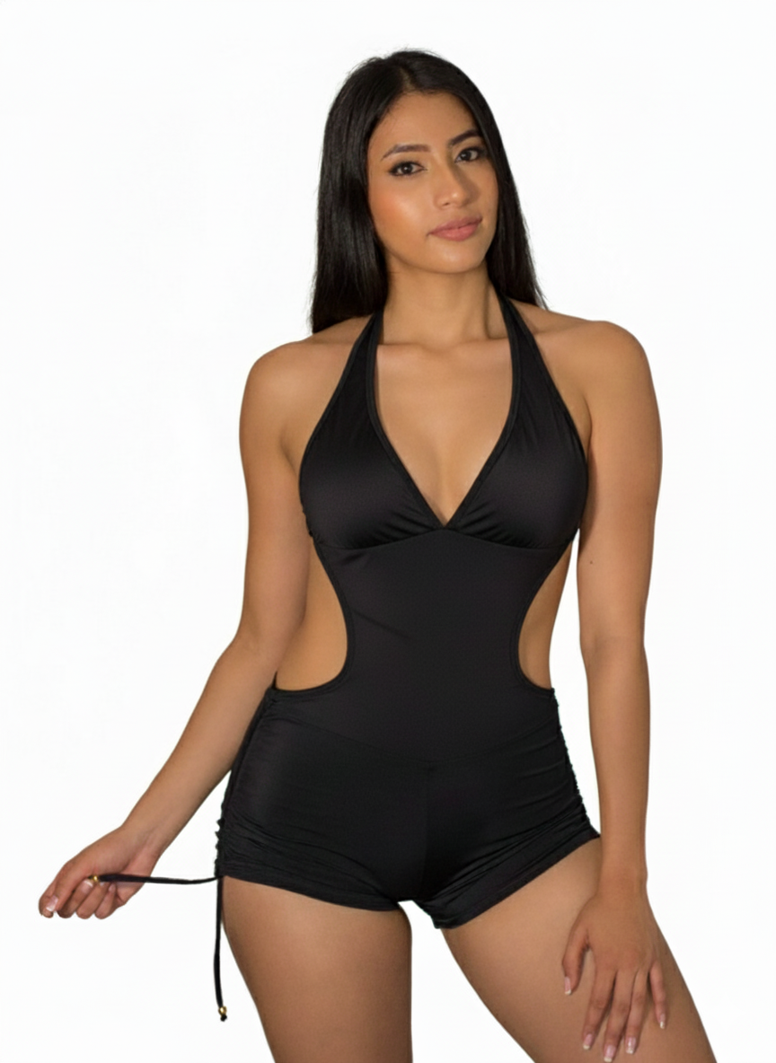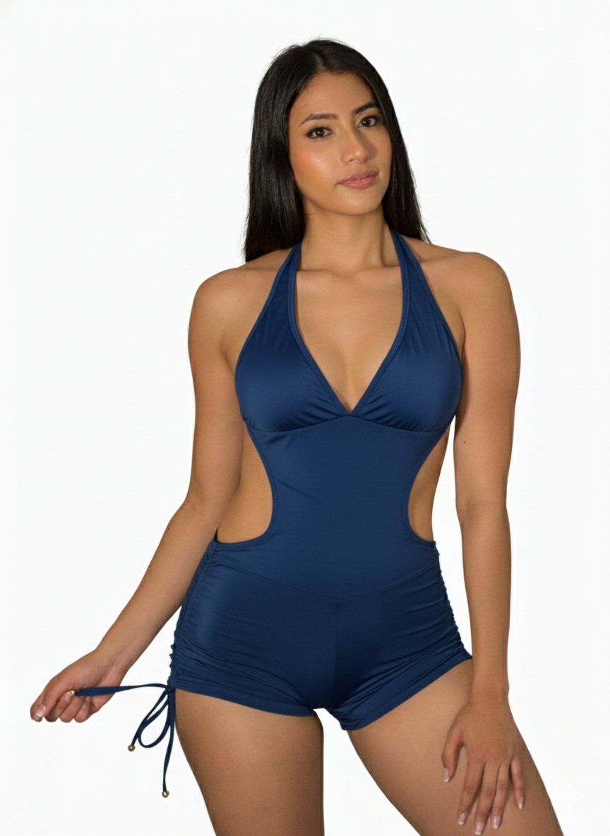 Vestido de Baño Trikini. Combina la audacia de un trikini con la comodidad de un short corto. En la parte superior presenta un escote profundo en V con tirantes que se anudan detrás del cuello para un ajuste seguro y personalizable. Cuenta con aberturas en los costados y espalda descubierta, revelando la cintura y añadiendo un toque seductor que define la figura. La parte inferior es un short con tirantes ajustables en los laterales lo que permite ajustar el short a cualquier tipo de cuerpo.