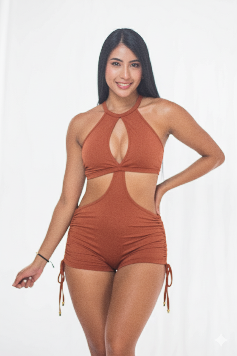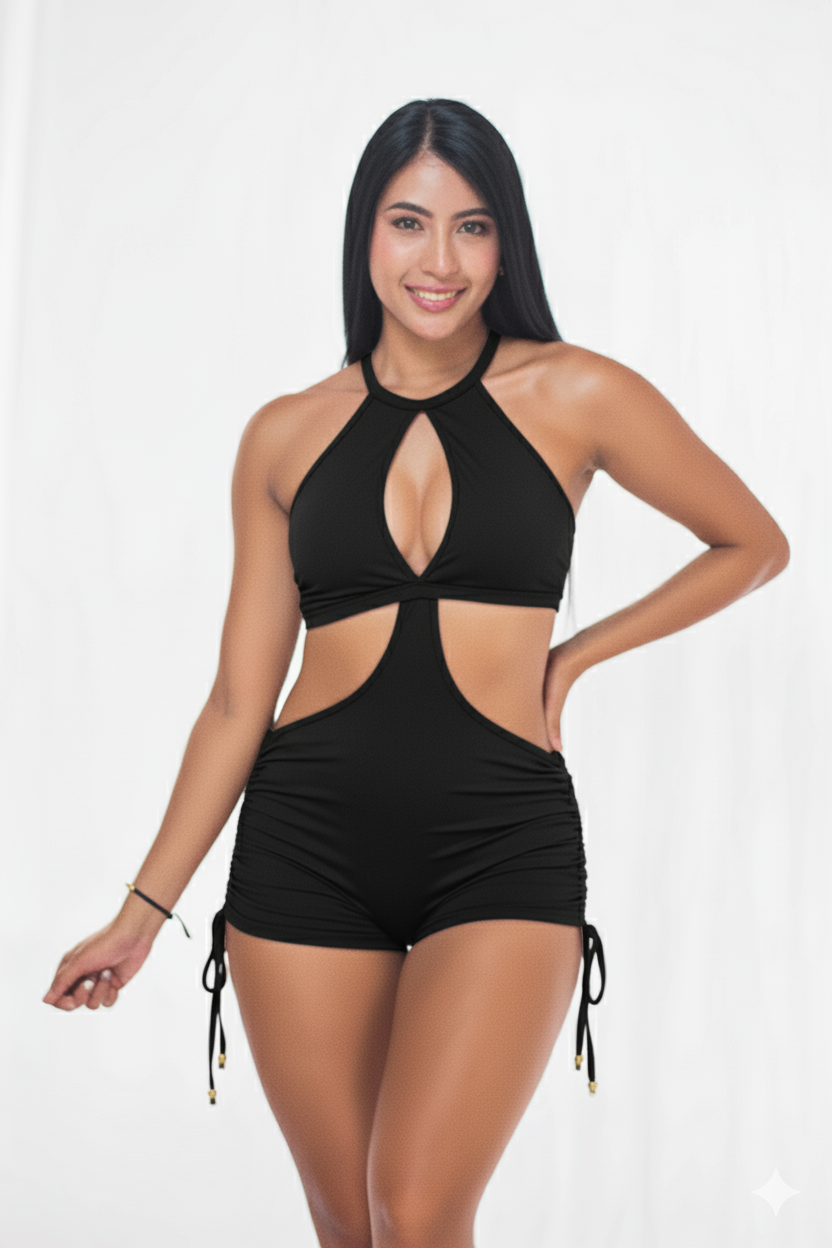 Vestido de Baño Trikini que combina un diseño de una sola pieza con la comodidad de un short. La parte superior cuenta con un corte tipo croptop y una abertura en el centro del busto. En la parte del torso presenta dos aberturas laterales, y en su espalda, un escote abierto con amarre ancho que permite ajuste personalizado. La parte inferior es un short que proporciona más cobertura, pues cuenta con dos tiras ajustables que permiten fruncirlo y obtener diferentes estilos creando un look moderno y a la vez seductor.