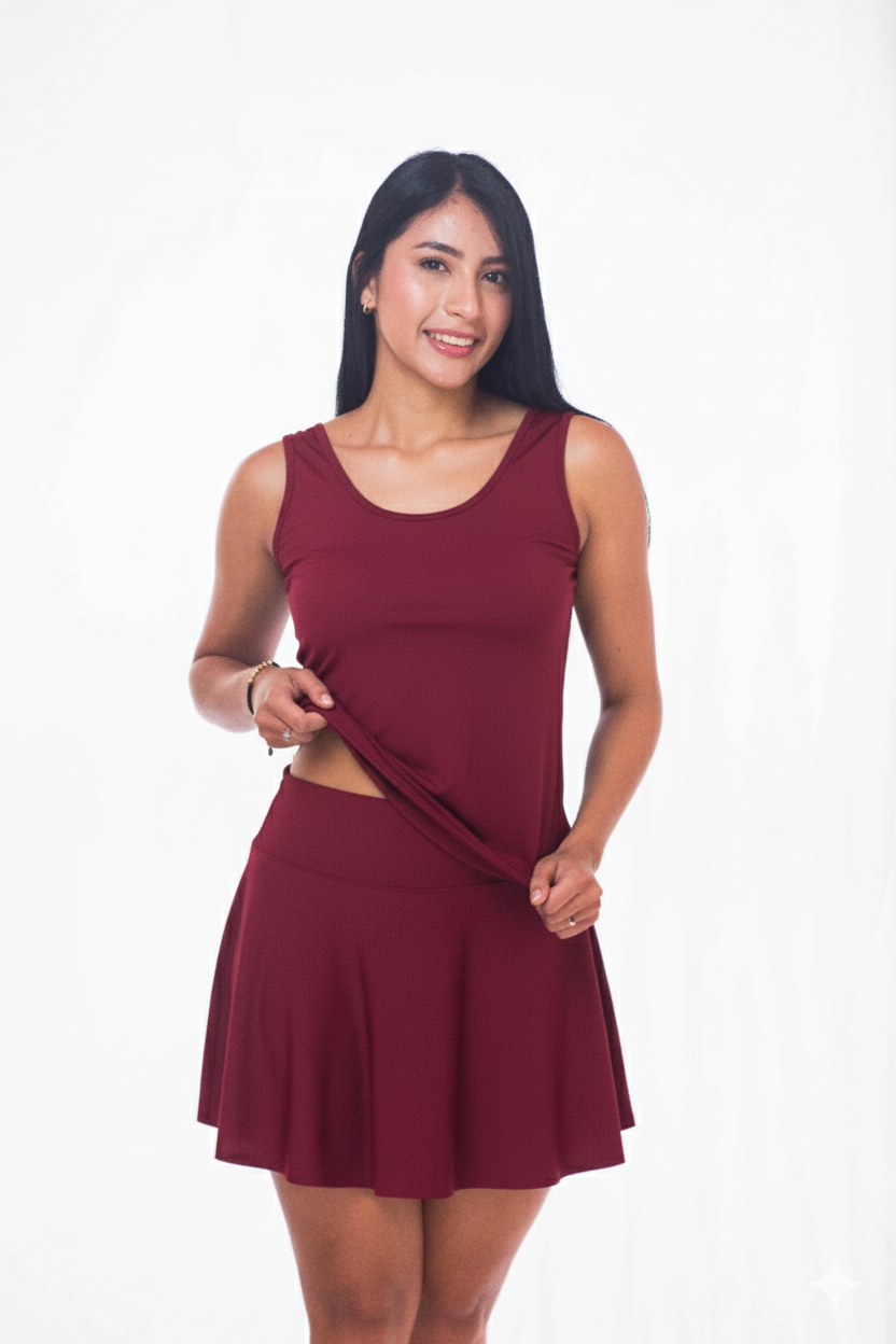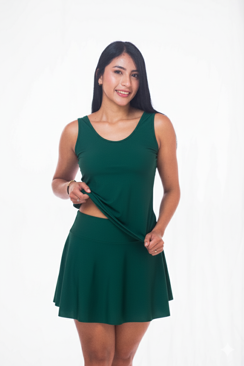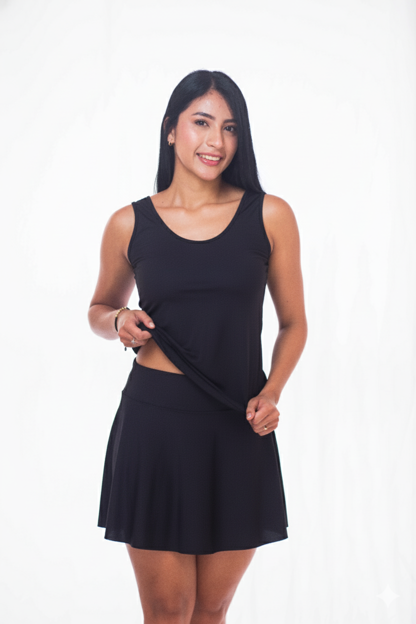 Vestido de Baño Dos Piezas. Ofrece un estilo fresco y máxima cobertura. Es un conjunto que combina una blusa que cubre el torso, un cuello redondo clásico y tirantes anchos, los cuales proporcionan un soporte cómodo. La parte inferior es una falda short acampanada que se mueve con fluidez, dándole un aire femenino y divertido al conjunto. Es perfecto para quienes buscan un estilo cómodo, con cubrimiento sin perder estilo.