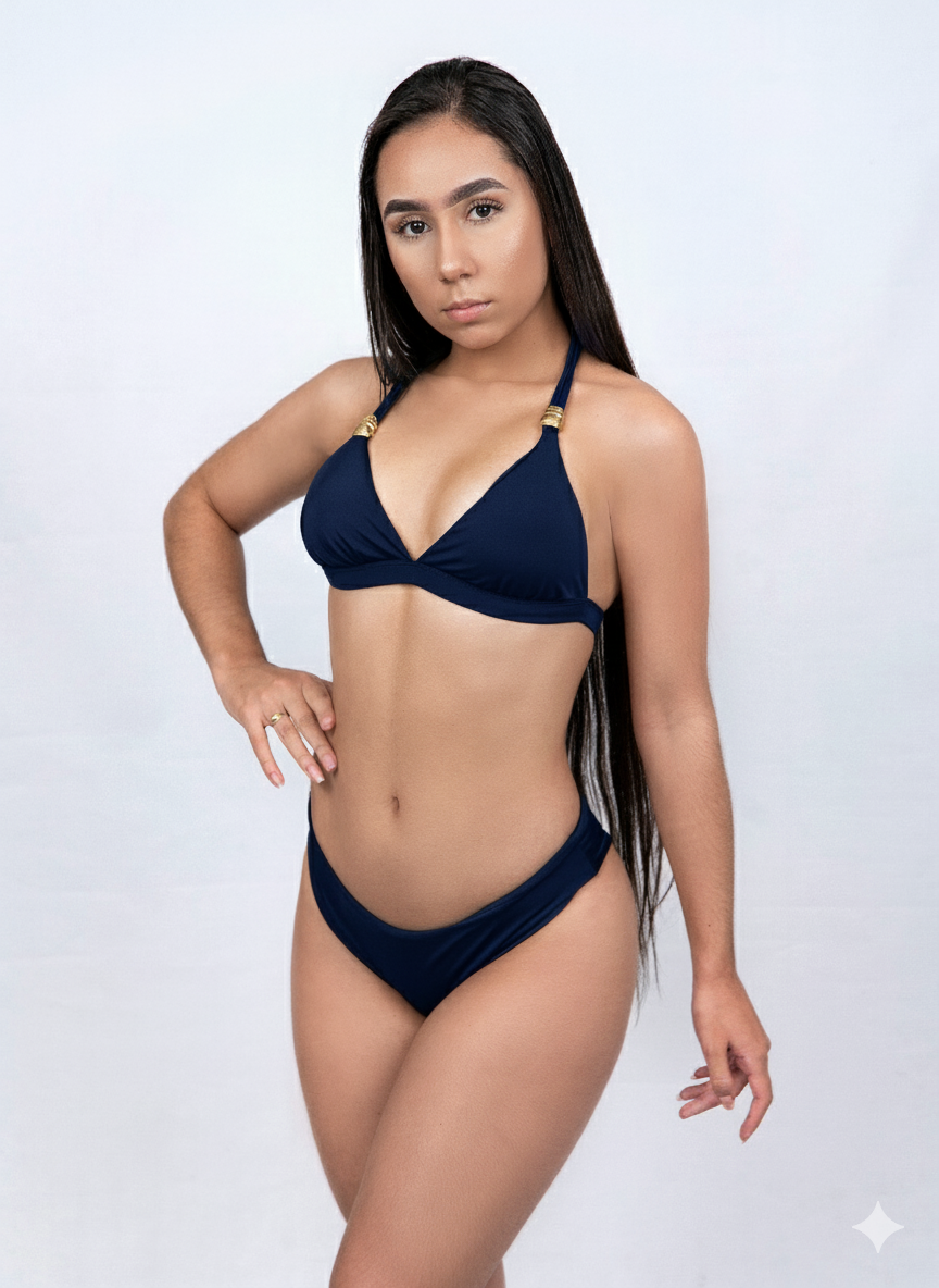Vestido de Baño Dos Piezas que combina estilo y funcionalidad. Este bikini presenta un top en forma triangular, con herrajes dorados en las cargaderas que aportan brillo y dinamismo. La banda en la base del top proporciona un ajuste cómodo y seguro. El panty cuenta con un recogido estratégico en la parte posterior que realza las curvas y garantiza un ajuste perfecto.